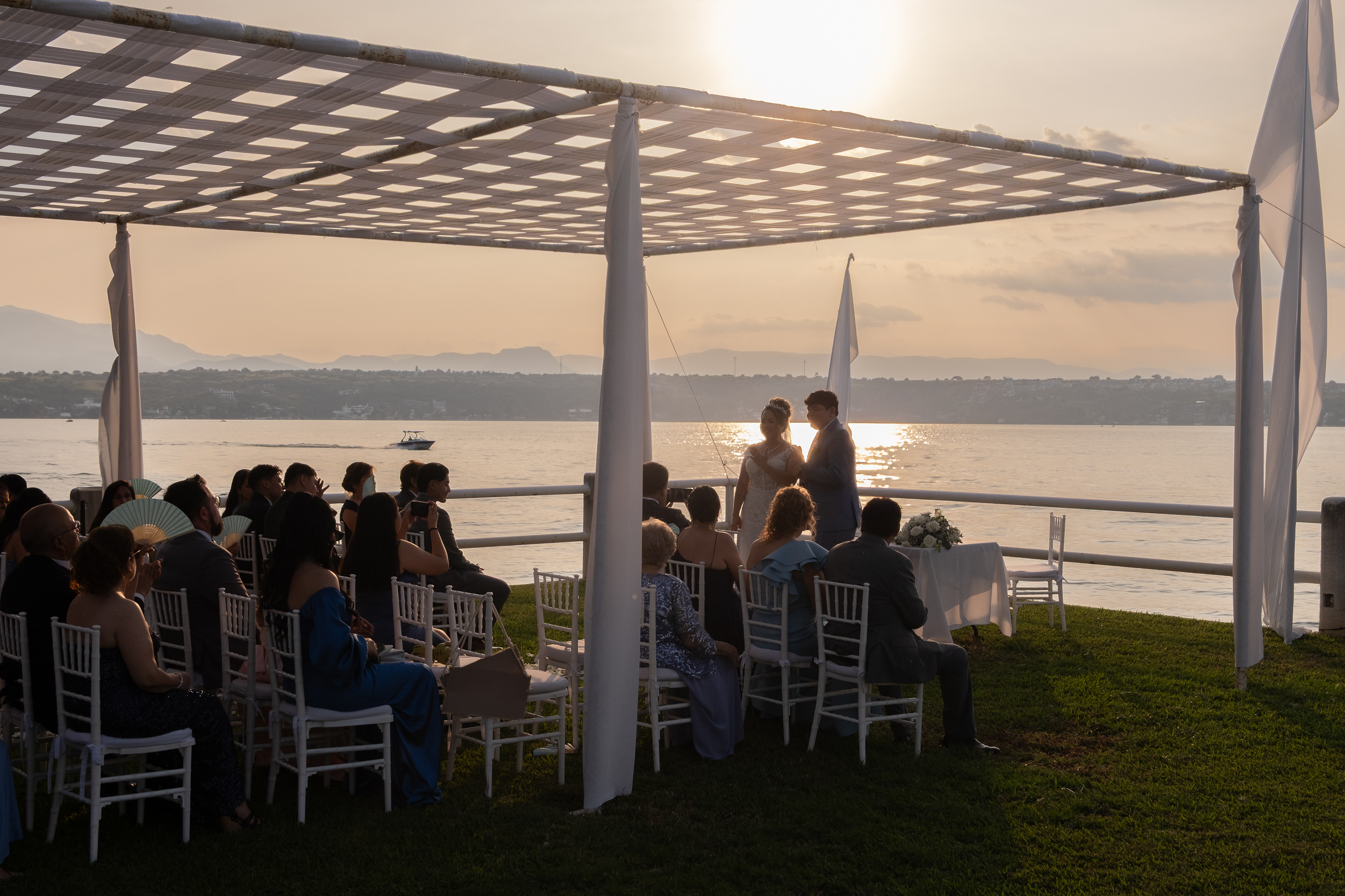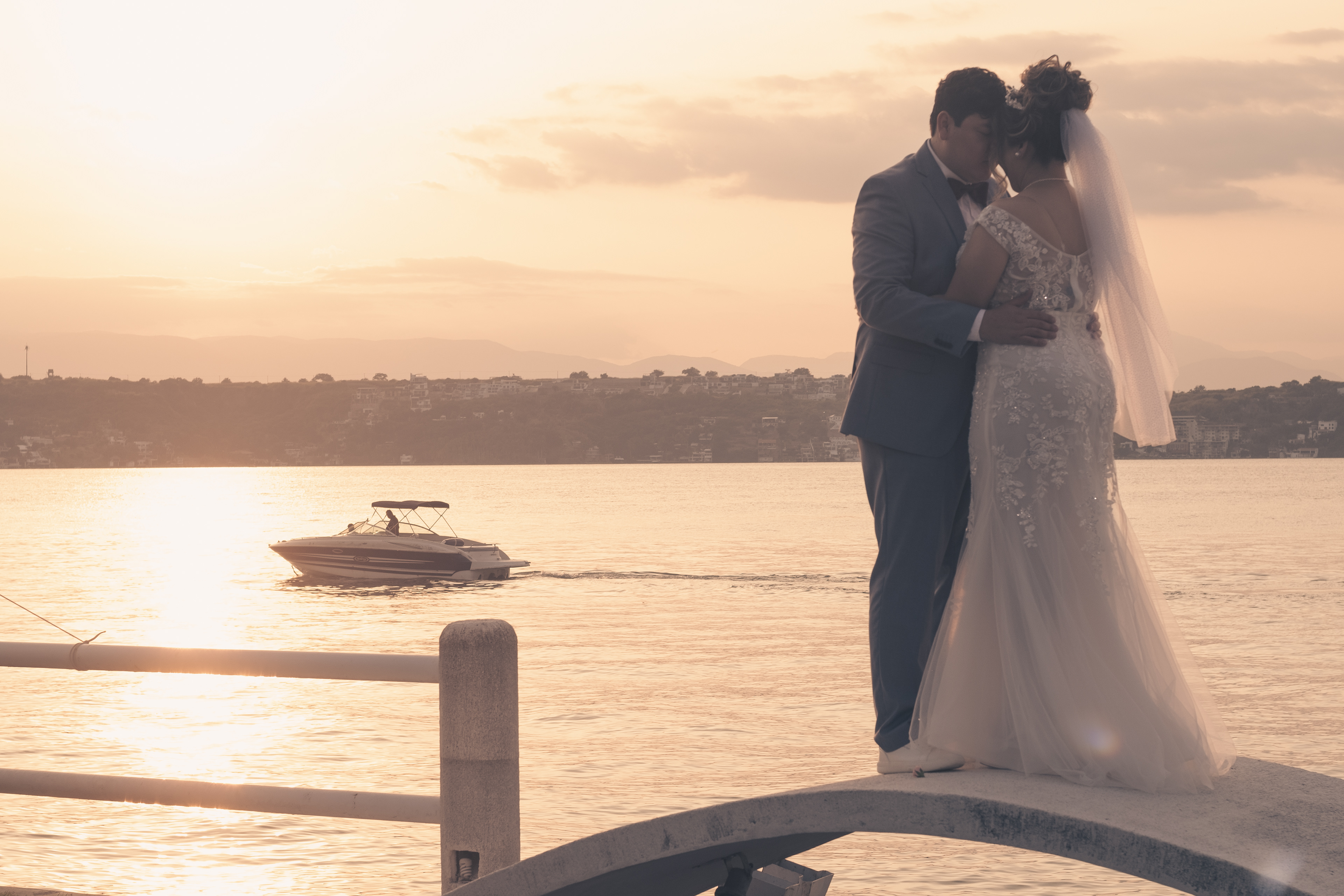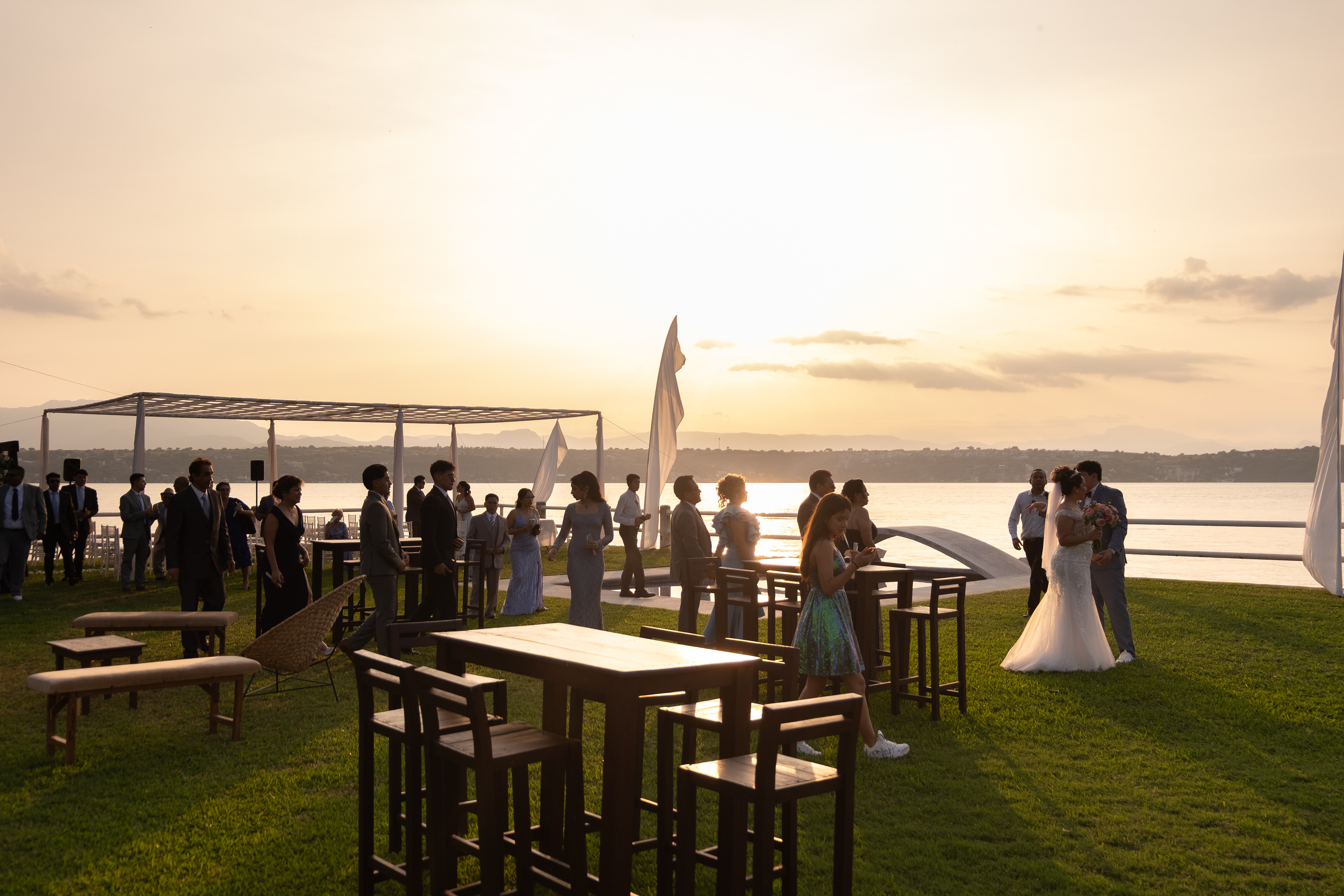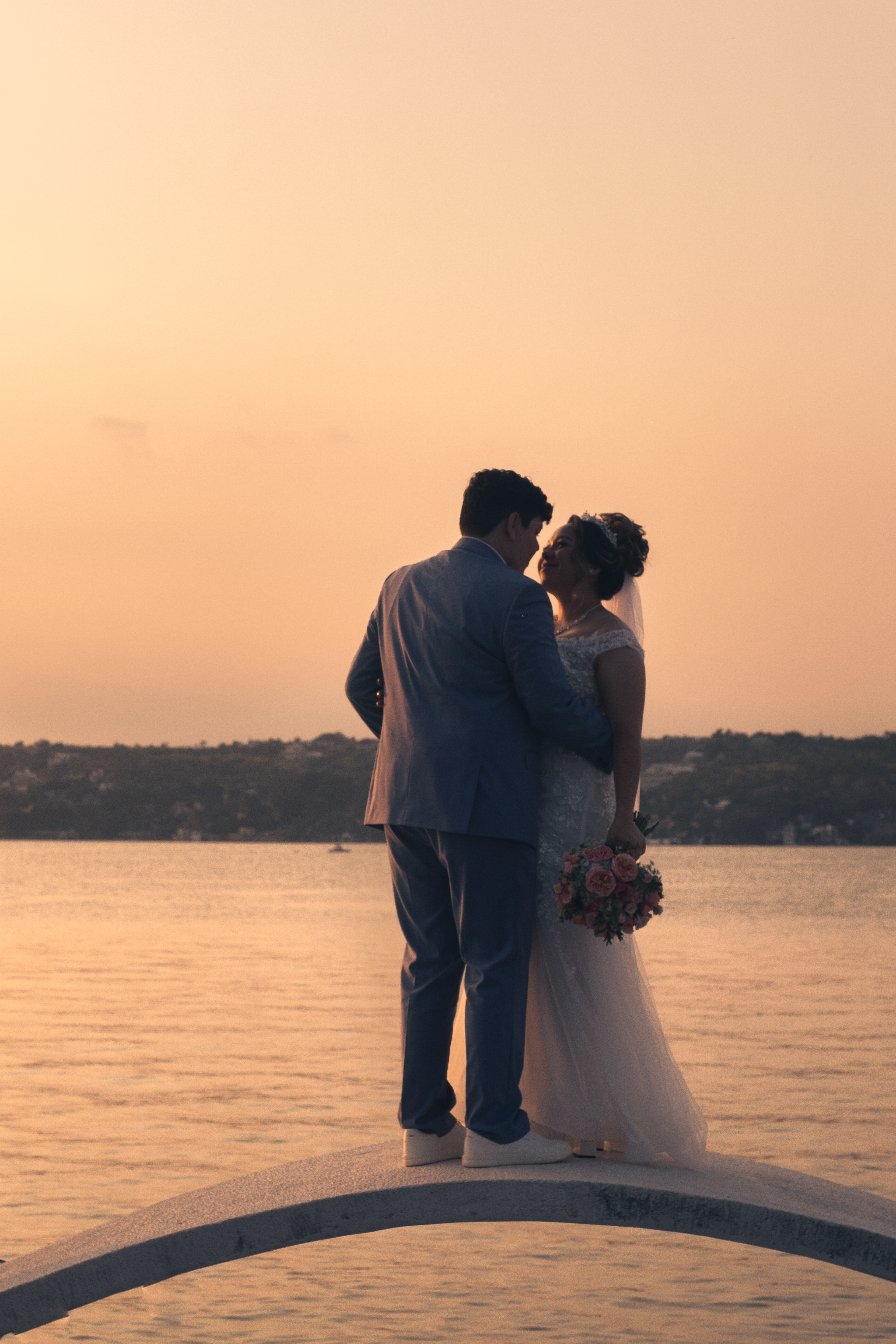 La boda se celebró frente al lago de Tequesquitengo, en un escenario abierto y rodeado de calma. El agua fue testigo de cada momento y, al caer la tarde, el cielo se pintó de tonos naranjas que envolvieron a los novios y a sus invitados. Algunos de los retratos más especiales surgieron en ese atardecer: siluetas, reflejos y miradas iluminadas por una luz cálida que parecía hecha a la medida del día. Un recuerdo que une el paisaje con la emoción de una promesa compartida.